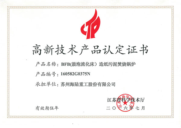 近日,公司收到江蘇省科學(xué)技術(shù)廳頒發(fā)的高新技術(shù)產(chǎn)品認(rèn)定證書, 我公司的研制BFB(鼓泡流化床)造紙污泥焚燒鍋爐獲省高新技術(shù)產(chǎn)品認(rèn)定。該產(chǎn)品主要用于造紙廠處理污泥工藝流程中,將造紙污泥干化后摻煤燃燒,解決污泥廢物處置問題,同時對污泥焚燒過程產(chǎn)生的熱量進(jìn)行回收,產(chǎn)生次高壓蒸汽用于發(fā)電或造紙工藝循環(huán)利用,實(shí)現(xiàn)了環(huán)境污染治理與資源循環(huán)利用并舉。