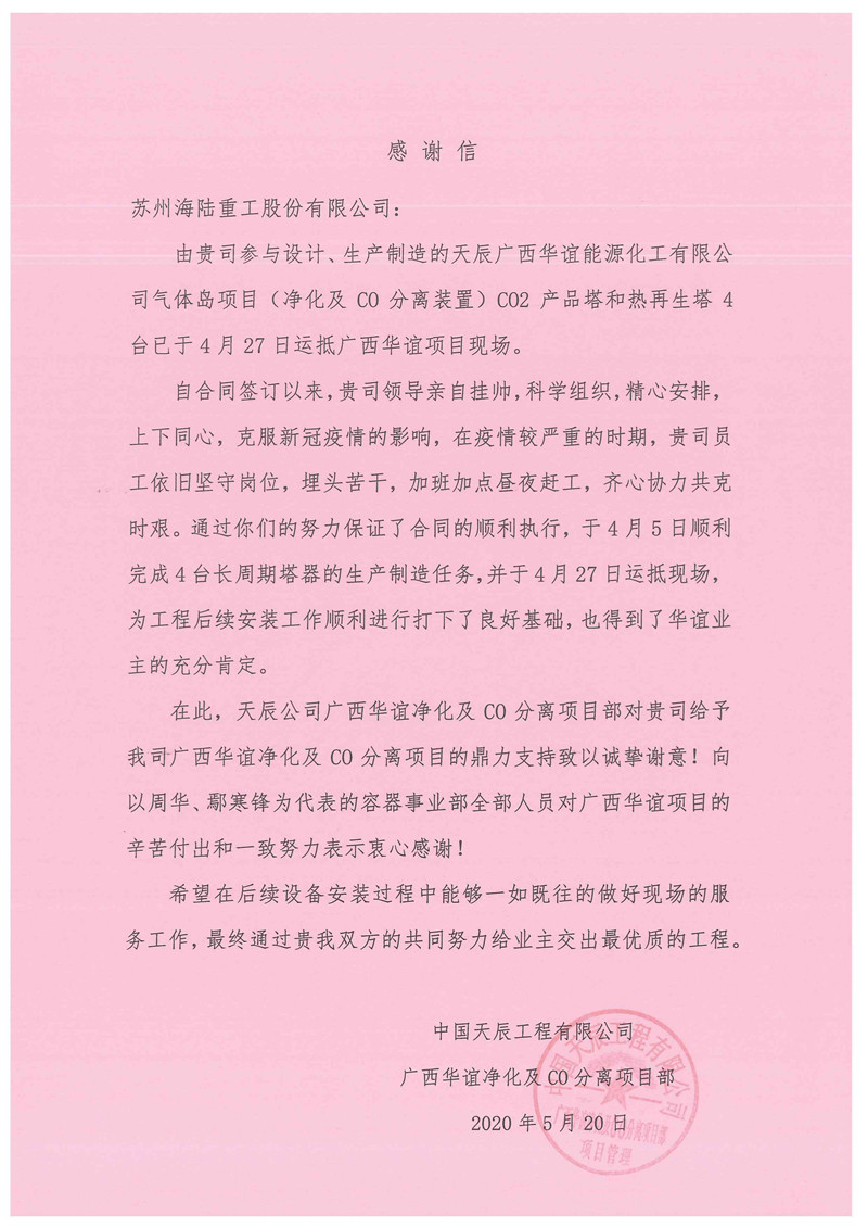 由于年初疫情的影響,廣西華誼項(xiàng)目現(xiàn)場(chǎng)出現(xiàn)了停工等待的不利局面,時(shí)間不等人,為保證客戶工期需求,“急客戶所急,想客戶所想”,海陸容器事業(yè)部全體干部職工上下同心,不畏困難,晝夜趕工,克服了疫情等諸多不利因素的影響,最終如期將產(chǎn)品交付客戶手中。